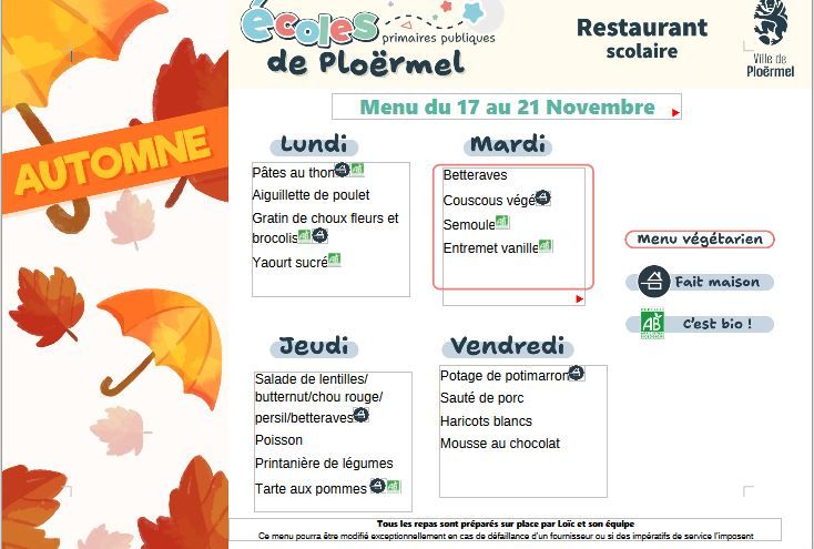 Voici ce que mangeront les enfants la semaine prochaine au restaurant scolaire.