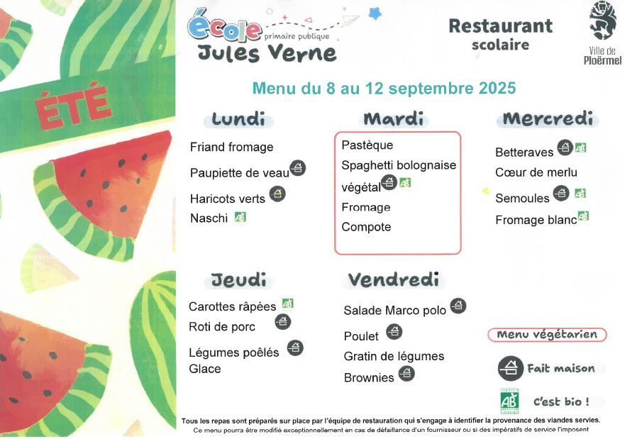 Menu de la semaine du 8 au 12 septembre 2025